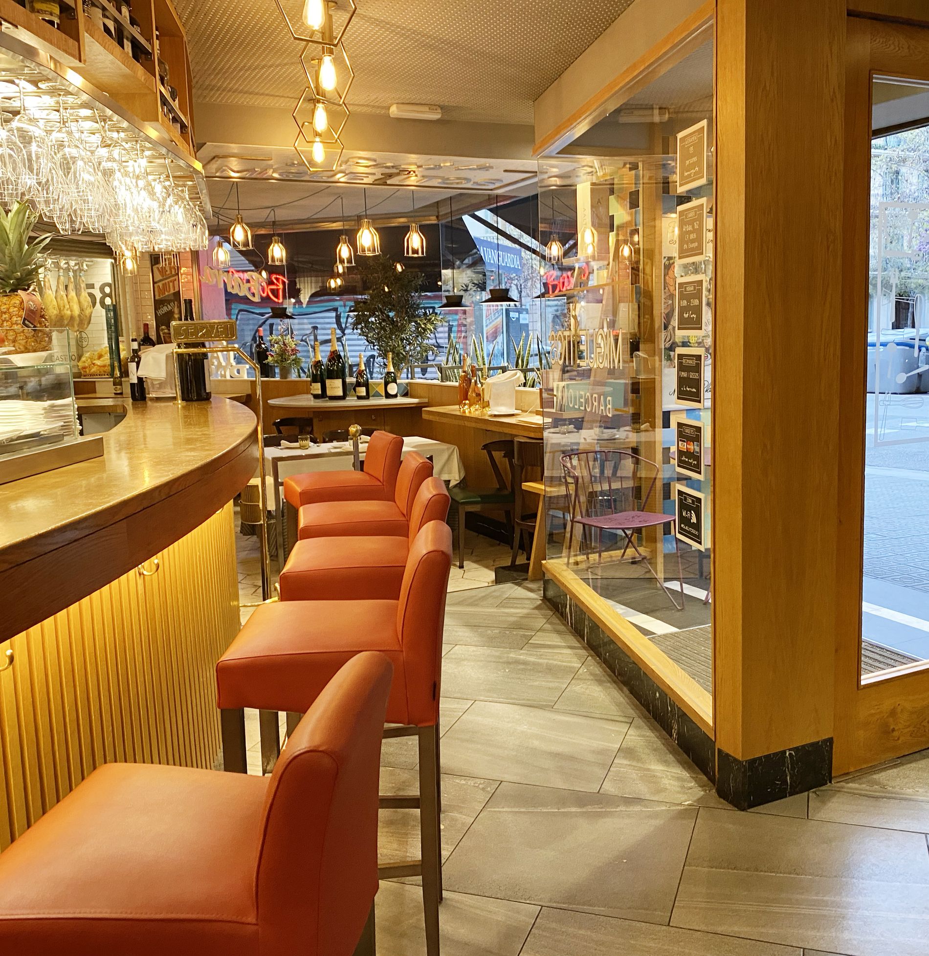 Miguelitos cuenta con una zona de barra, varios salones comedor y una sala completamente privada. Cada espacio tiene su propia decoración y personalidad, recreando distintos ambientes para que elijas dónde sentirte más a gusto, siempre con tu comodidad como prioridad.